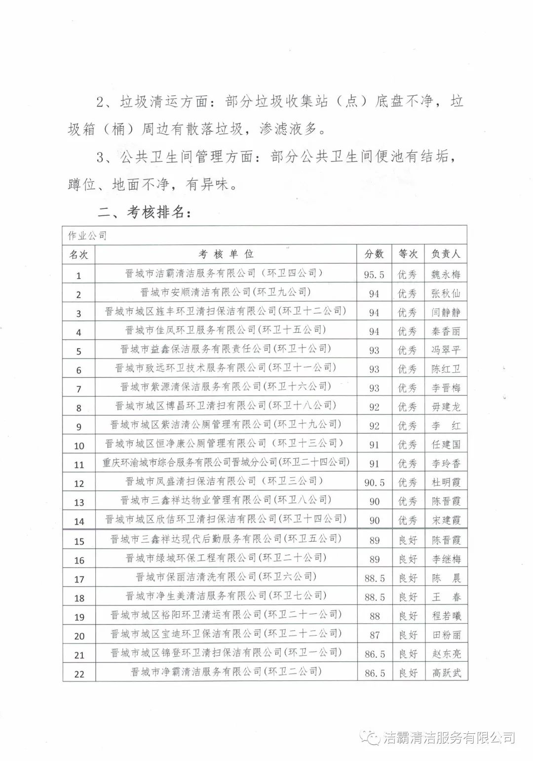 2020年10月28日—10月30日,晉城市城區(qū)市容環(huán)衛(wèi)中心由中心督查室牽頭組織,中心班子成員分別帶隊(duì),機(jī)關(guān)全體人員參加,對各作業(yè)公司道路清掃路段、垃圾收集站(點(diǎn))和公廁采用交叉檢查和隨機(jī)抽查的方式對24個(gè)作業(yè)公司的環(huán)境衛(wèi)生作業(yè)質(zhì)量和4個(gè)監(jiān)理公司的日常檢查情況進(jìn)行了考核。晉城市潔霸清潔服務(wù)股份有限公司所屬的環(huán)衛(wèi)四公司分?jǐn)?shù)最高,名列第一。