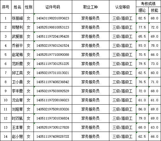 山西潔霸清潔服務(wù)集團(tuán)股份有限公司職業(yè)技能等級(jí)認(rèn)定中心2025年9月13日第2批家政服務(wù)員(家務(wù)服務(wù)員)高級(jí)認(rèn)定人員成績(jī)公示